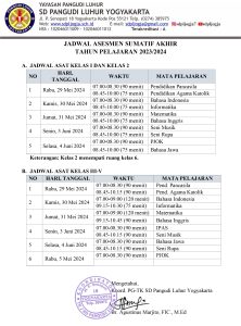 - Rabu, 29 Mei 2024 s/d Rabu, 5 Juni 2024 akan dilaksanakan Asesment Sumatif Akhir bagi peserta didik kelas I – V SD Pangudi Luhur Yogyakarta. (Jadwal Terlampir)