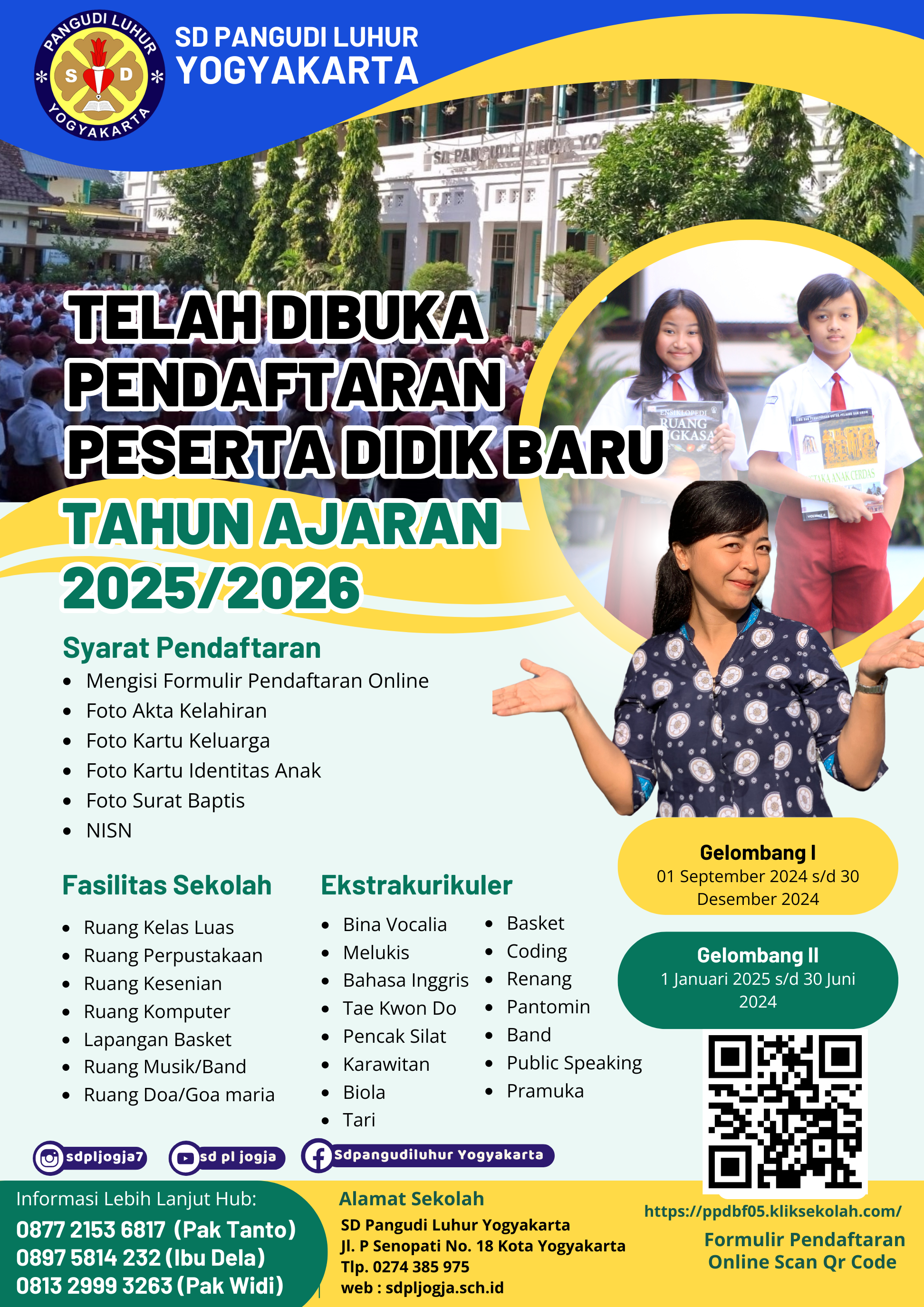 Telah dibuka pendaftaran peserta didik Baru Tahun Pelajaran 2025/2026 SD Pangudi Luhur Yogyakarta, adapun Tatacara pendaftran sebagai berikut: Scan Barcode / Kunjungi web PPDB :