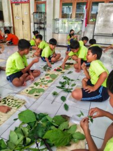 Inilah tahap yang paling seru! Siswa menata daun di atas kain sesuai imajinasi mereka, menggulung rapat, lalu mengukusnya menggunakan teknik steam. Dari proses inilah lahir motif-motif alami yang unik, autentik, dan menawan — hasil karya tangan para siswa sendiri.