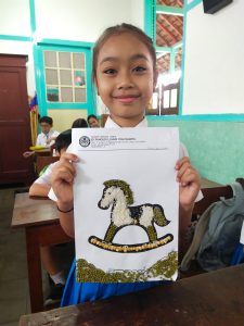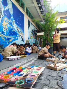 Kreativitas siswa kembali diasah dengan membuat gasing dari tutup botol minuman plastik dan kitiran jepret. Setelah selesai, mereka mencoba bermain bersama dengan mainan yang telah dibuat.
