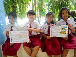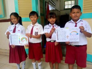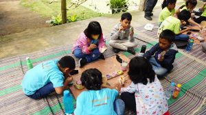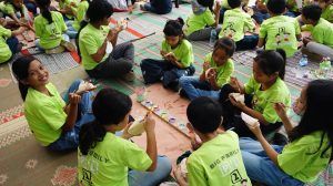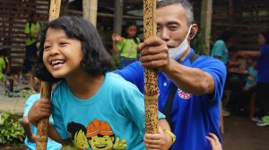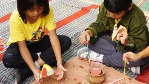 Sesampainya di Rik Rok, anak-anak dibagi menjadi beberapa grup. Grup pertama melukis topeng sedangkan grup ke dua membuat gantungan kunci dan sebaliknya. Celoteh dan ekspresi mereka sungguh menggemaskan. Meskipun kegiatan hari itu terkesan ramai, tapi anak-anak mengerjakan segala sesuatu dengan tertib, khas anak Pangudi Luhur. Semua anak saling bertoleransi menunggu giliran masing-masing, tidak ada yang mendahului, kegiatan berjalan dengan tertib. Ada satu kegiatan yang sempat mengejutkan kami semua di Rik Rok yaitu setelah selesai melukis dan membuat gantungan kunci, ternyata anak-anak diminta untuk bermain permainan tradisional. Permainan tradisional tersebut diantaranya adalah egrang dan balapan bakiak. Wah…suasana pun menjadi riuh…ramai dan heboh. Tambah lagi satu pengalaman tentan gpermainan tradisional.